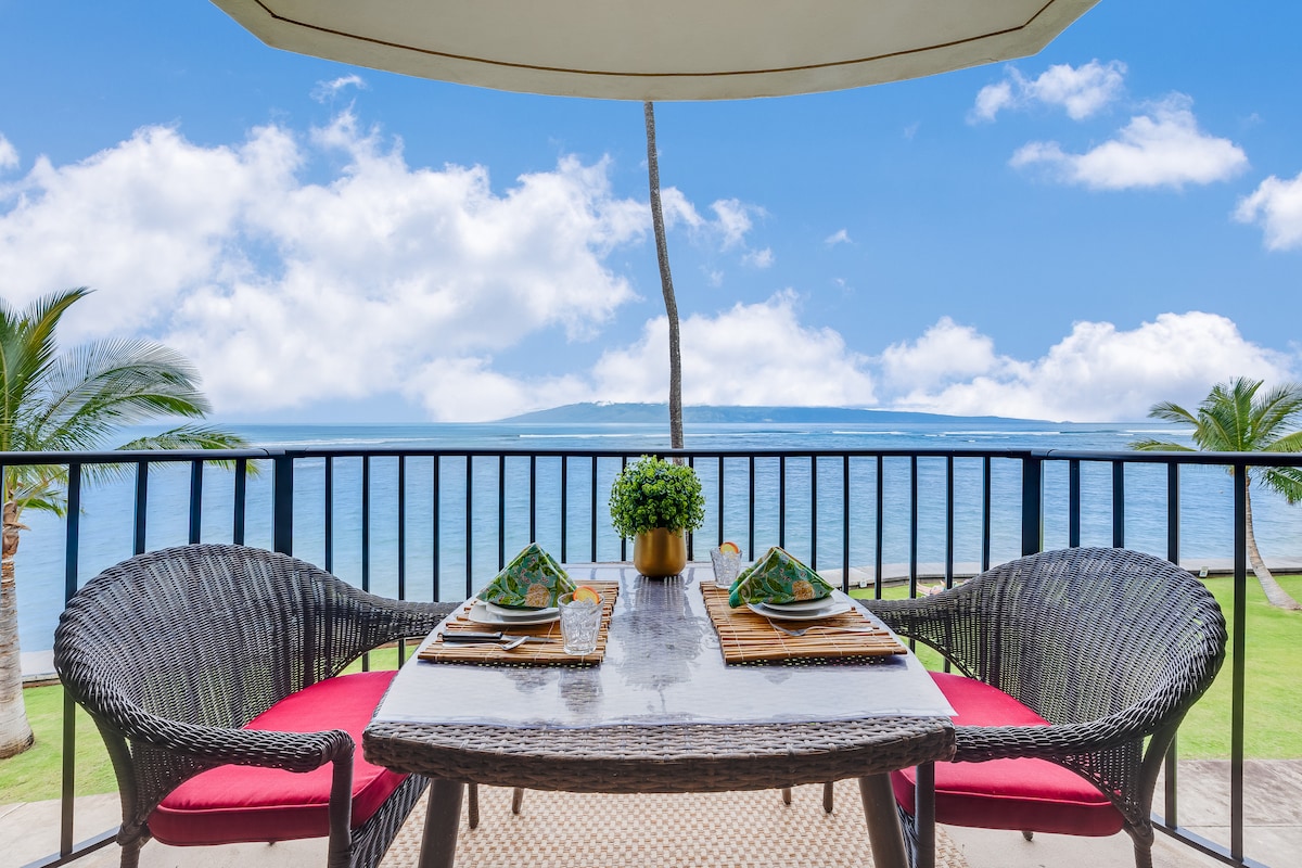 *Available for booking! Thankfully, our condo is not located in the wildfire affected area* Enjoy breathtaking panoramic views in this remodeled oceanfront corner condo located on Kahana Beach! With floor-to-ceiling windows in both the living and bedroom, gentle breezes and sunsets can be enjoyed lounging on the couch or relaxing in bed. Imagine falling asleep to the lull of ocean waves at your feet and waking to spouting whales in the background. Truly an oasis on the Valley Isle.