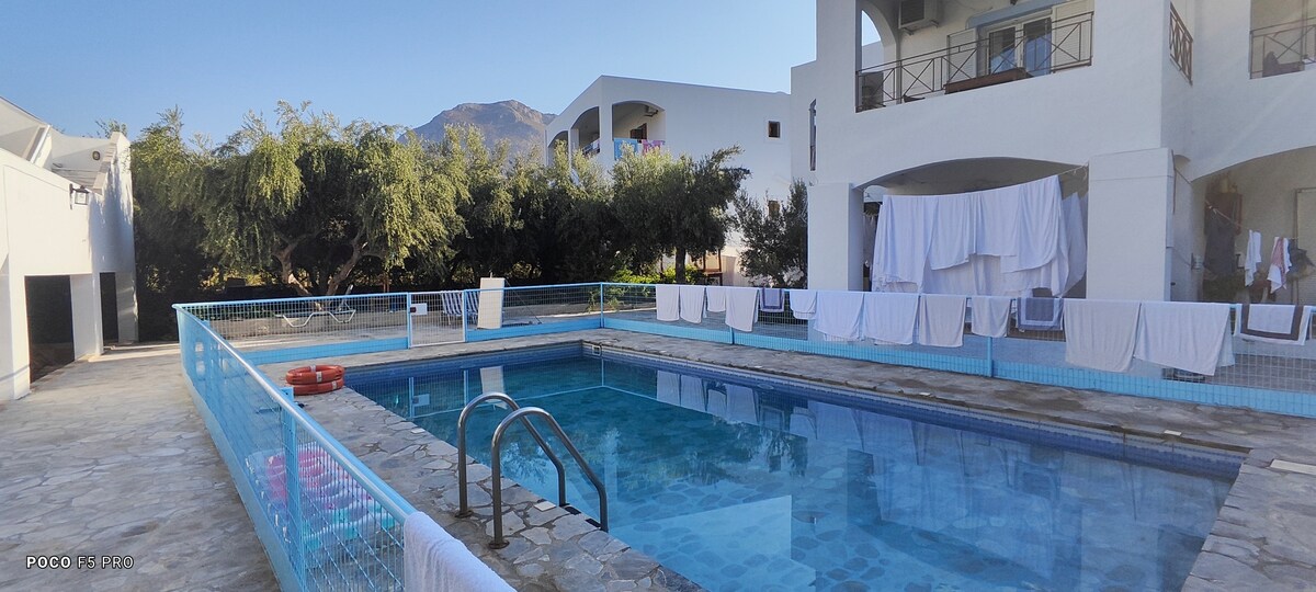 In Massouri Armeos direct under Grande Grotta. Just renovated, colourful painted and with nice details. Every studio has an own balcony to the seaside. Additionally we've a big terrace to the mountainside with a big common table and barbecue. Fast Wifi and a working place making homeoffice/woking remote easy.