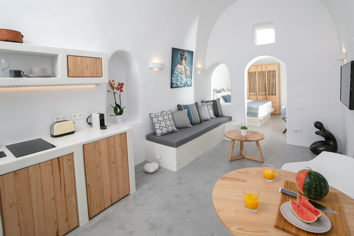 La suite Anemos si trova ad Akrotiri e offre una vista sulla caldera e sulle isole vulcaniche. È una suite con piscina privata riscaldata a sfioro in stile grotta, con sistema a getto e patio privato. C'è un letto king-size che può ospitare due persone. La colazione giornaliera è inclusa e servita in suite. È incluso un servizio di pulizia. Comunicaci in anticipo i dettagli del tuo arrivo, così potremo organizzare un taxi/trasferimento per te.