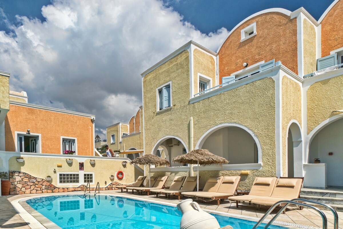 Accogliente appartamento nel cuore di Thira . Una camera per due con un letto molto comodo, un bel balcone e una piccola cucina fornita di tutto il necessario per il tuo soggiorno . Una piccola piscina( non privata )per le giornate di sole. Siamo situati a soli 100 metri dal centro potendo offrirvi un soggiorno piacevole e tranquillo ma anche poter raggiungere tutto con una passeggiata di 2 minuti. Vicino alla stazione degli autobus, ristoranti , caffetterie e bar.