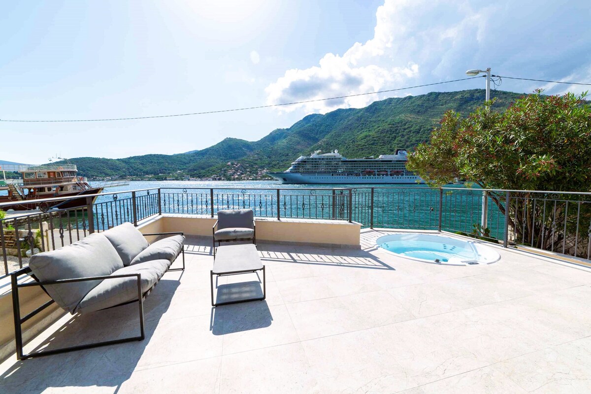 🏡VILLA RIVIERA APPARTAMENTO 1– Lusso sul mare nella baia di Boka, Montenegro. Sperimenta eleganza e comfort in un rifugio sul mare a Lepetani, a pochi minuti in auto da Tivat. Goditi una vista mozzafiato sul mare e servizi premium per un soggiorno davvero rilassante Caratteristiche: Vista sul✨ mare dalla terrazza privata di 36 m² e Jacuzzi 🛏️ 1 camera da letto con letto king-size + divano letto per 2 🚿 1 bagno e mezzo Cucina 🍽️ completamente attrezzata con zona pranzo 📺 2 TV LED per l'intrattenimento 🚗 Parcheggio gratuito 🛋️ Armadio e tende oscuranti per un soggiorno riposante