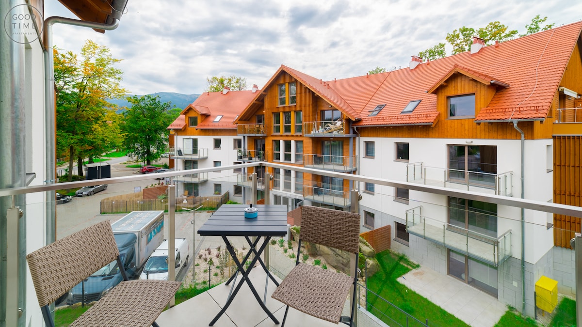 Piękny apartament z widokiem na góry i bezpłatnym dostępem do strefy SPA. Mieszkanie składa się z sypialni, salonu z kuchnią i łazienką. Wyposażony w wygodne łóżka i komfortowe szafy. Kuchnia w pełni wyposażona, łazienka z pralką i prysznicem. Apartament położony jest w GREEN PARK RESORT, w tym samych budynku co cała strefa SPA(basen wewnętrzny i zewnętrzny,sauny,siłownia,plac zabaw dla dzieci, restauracja. Miejsce parkingowe w cenie.T:503059476