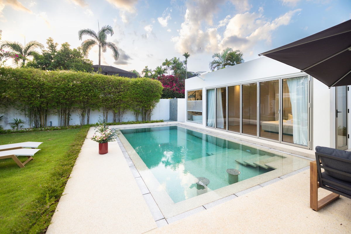Villa di lusso dal design moderno con piscina privata, perfettamente adatta al vostro soggiorno in famiglia o con gli amici. Situata in una zona tranquilla, vicino a tutti i servizi e alle spiagge di Rawai e Naiharn, questa sontuosa villa dispone di una piscina interamente rivestita in marmo e dotata di un sistema di filtrazione dell'acqua salata. All'interno, avrete a disposizione 140 m2 suddivisi in un ampio soggiorno aperto su una cucina completamente attrezzata, nonché 3 camere da letto con bagno privato.