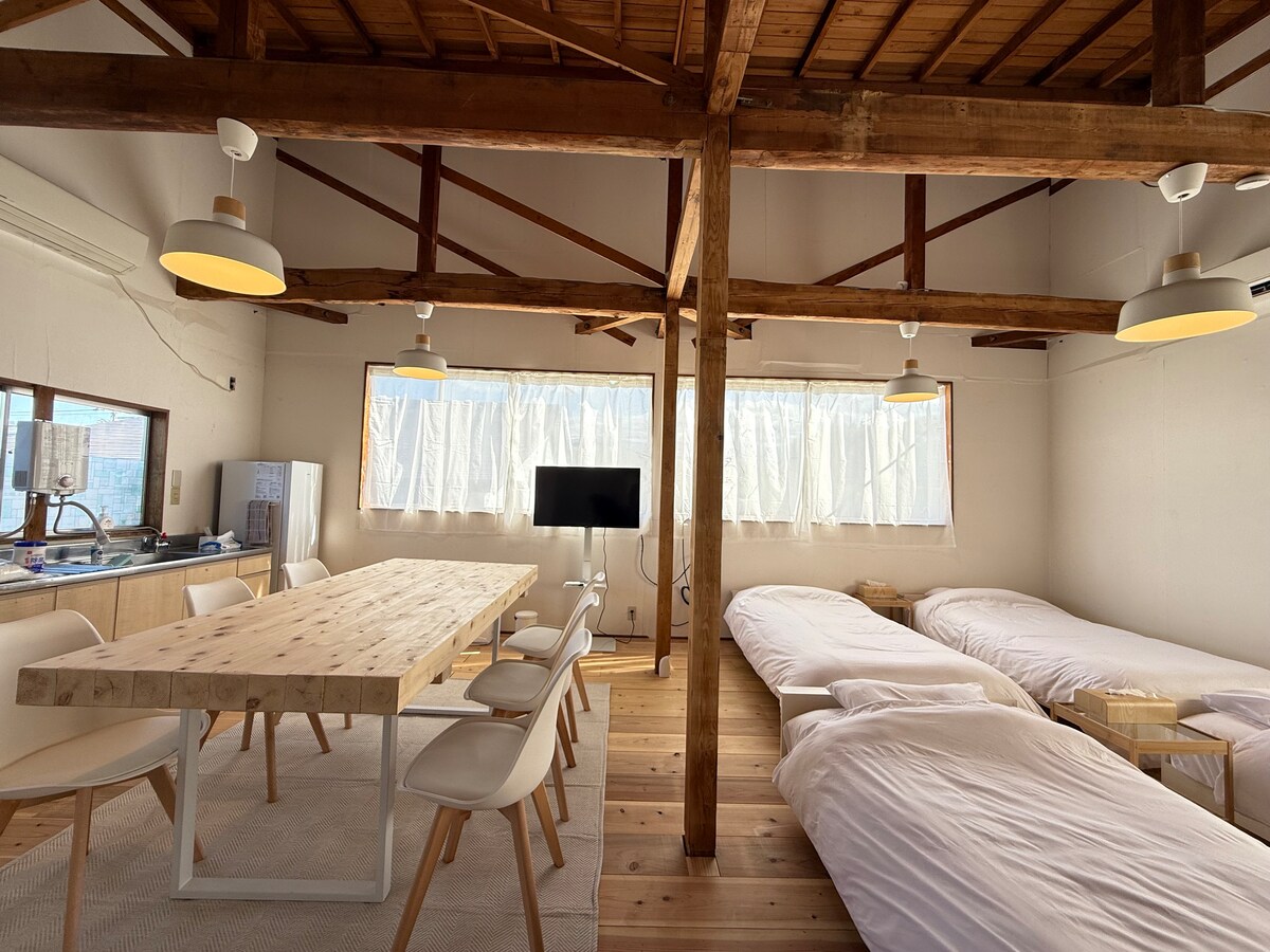 A 1,5 ore dall'aeroporto di Sendai (voli diretti da Taipei/Kaohsiung). Auto a noleggio necessaria. Parcheggio: 8 auto. Gite di un giorno: Zao Ski 30 min / Sendai 1,5 ore / Ginzan Onsen 1,5 ore / Yamadera 40 min Cucina per 14 persone, aria condizionata e riscaldamento (-6°C OK), lavatrice/asciugatrice, Wi-Fi. A persona: 6→¥10.000 / 10→¥6.000 / 14→¥4.300 (tariffa fissa, più ospiti=più conveniente) Per gruppi composti da più famiglie, 3 generazioni e amici. Rifugio privato tra i frutteti. Goditi la vista su Zao e le stagioni di Yamagata.