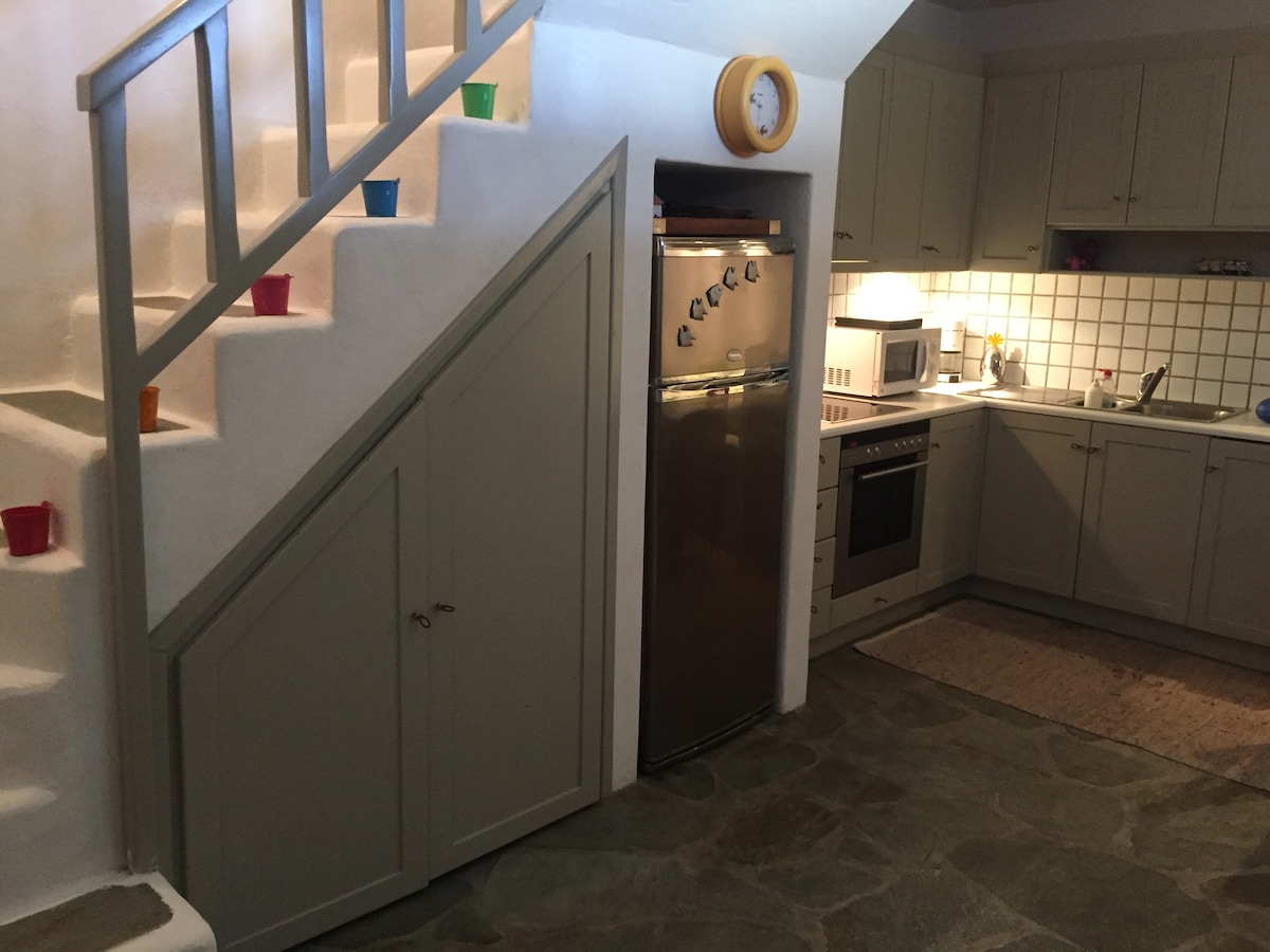 La casa si trova sulla cima di una bassa collina che gode di una splendida vista panoramica sia sul Mar Egeo e la capitale(Chora) dell'isola.Situata in una zona abbastanza rurale, dista solo 1,2 km dal porto e 0,7 km dalla spiaggia di Gialiskari, offrendo un'esperienza di vacanza unica.Ideale per famiglie con bambini o gruppi di amici, in quanto può ospitare fino a 8 persone.