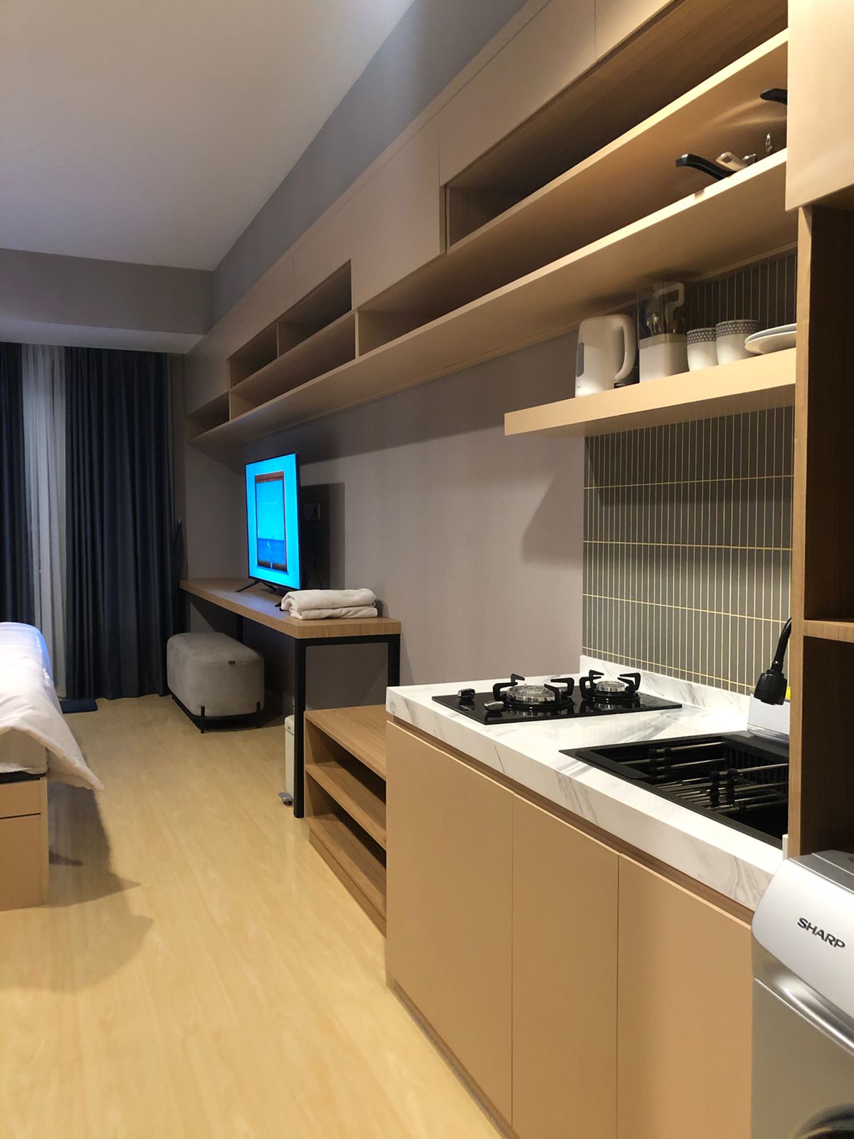 Un elegante monolocale di 24 m² nel centro di Giacarta, che unisce stile e comodità. Include cucina, Wi-Fi veloce, purificazione dell'aria, smart TV da 43", impianto audio e Netflix. È ideale per vari tipi di soggiorno, con accesso senza contatto e servizi come piscine, vasca idromassaggio, palestra e basket. Ora dispone di un distributore a osmosi inversa e di un sistema di smaltimento dei rifiuti alimentari, L'immagine mostra una stufa a gas che è stata sostituita da un fornello a induzione (per seguire le linee guida dell'appartamento per i rischi di incendio)