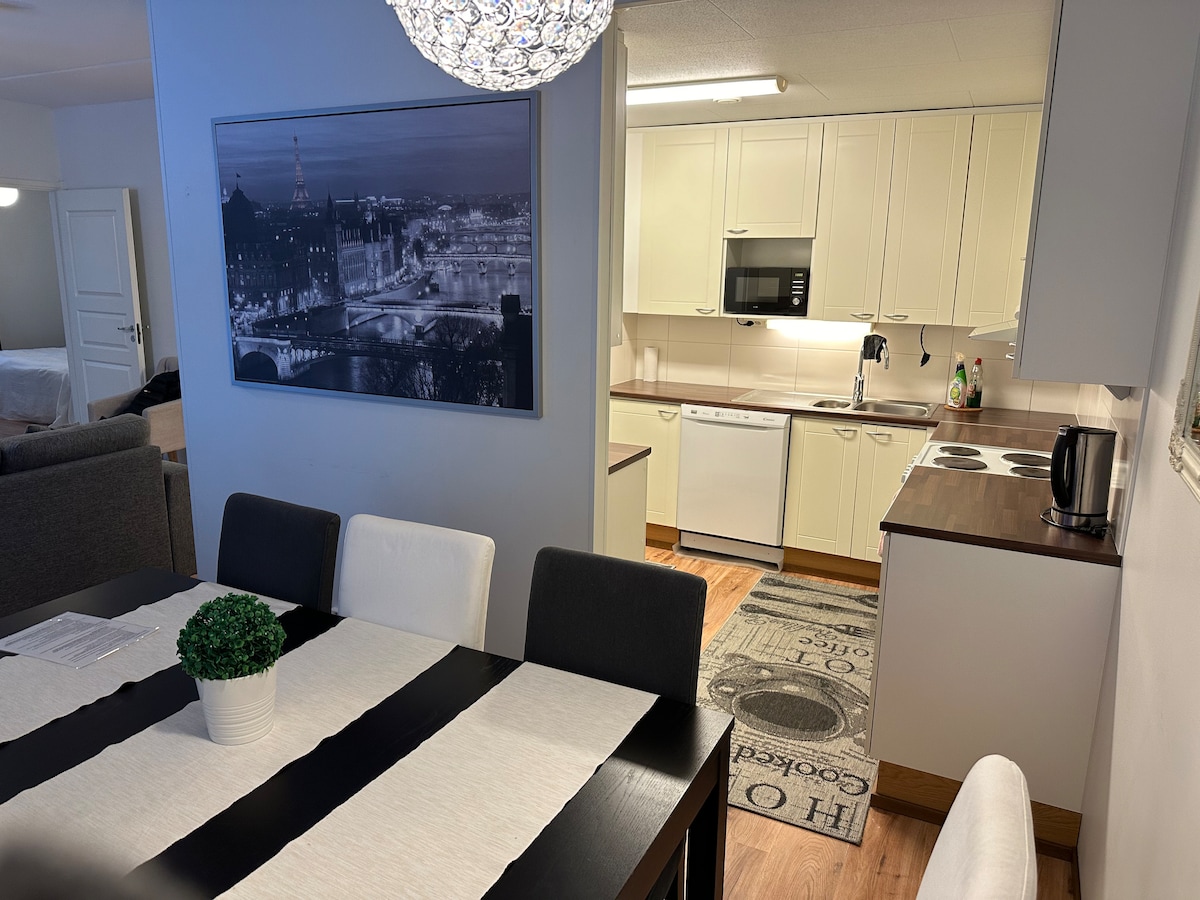 Kotoisa kaksio rauhallisen talon kolmannessa kerroksessa. Talossa ei ole hissiä. Asuntoon ei saa tuoda eläimiä. Helppo tulla E8 tieltä. Makuuhuoneessa 180cm parisänky, voi myös erottaa. Olohuoneesta löytyy 120cm sänky sekä yksi lisäpatja. Vauvan matkasänky ja syöttötuoli. Keittiöstä löytyy astiasto, ruoanlaitto välineet, kahvinkeitin, mikro, vedenkeitin, leivänpaahdin, jääkaappi pakastinlokerolla. Kylpyhuoneesta löytyy suihku ja pyykinpesukone. Autolle lämpöpistokepaikka takapihalla.