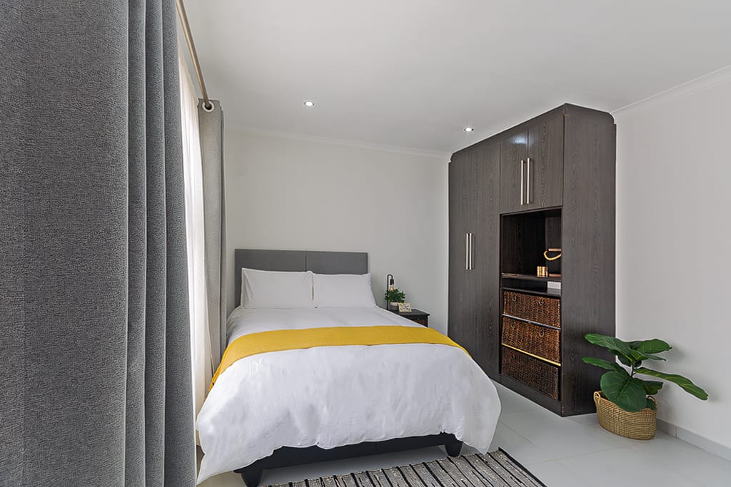 A 15 minuti dall'aeroporto OR Tambo. Questo elegante spazio in bianco e nero, in un complesso recintato e sicuro, offre un mix perfetto di comfort e comodità. Goditi un posto auto dedicato, uno stile di vita semplice e l'accesso al cancello a distanza. Con un lussuoso letto matrimoniale e un letto a due piazze, una zona ufficio e il wifi ad alta velocità, è ideale per lavorare o rilassarsi. La cucina completamente attrezzata include un piano cottura a gas e una lavastoviglie. Rilassati sull'accogliente balcone e goditi mobili, biancheria da letto e articoli da cucina di alta qualità.