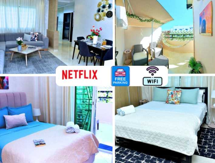 Modern 83 m² 2BR in downtown,4 min to Sebou River, 10 min to Mehdia Beach, 5 min to train station. Walk to cafés, restaurants, and shops. Secure, family-friendly residence. King-size master with en-suite, queen-size room with balcony. Cozy living area, 55" 4K smart TV with Netflix, second bathroom, equipped kitchen, high-speed Wi-Fi, spacious balcony with seating and hammock. Perfect for remote workers, couples, and families. Enjoy comfort, convenience, and a relaxing stay near top attractions.