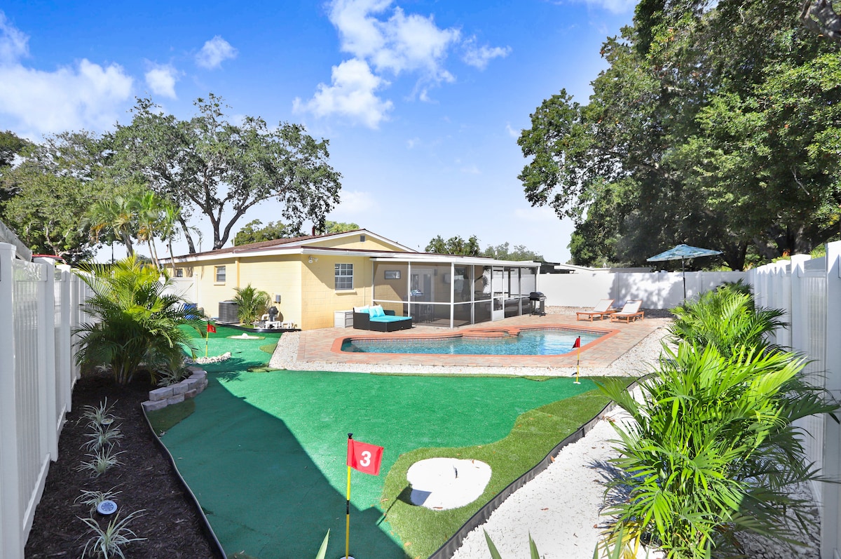 Catch up with family and friends in this stylish vacation home 🏡 just minutes from the white sandy beaches of Tampa Bay. We’ve got your beach days covered with chairs, towels, and even a cooler so you can simply relax and soak up the sun. After a day at the beach, entertain the whole family with our private mini golf course ⛳️, cool off in the sparkling pool, and enjoy a thoughtfully designed interior that blends comfort and style for the perfect getaway.