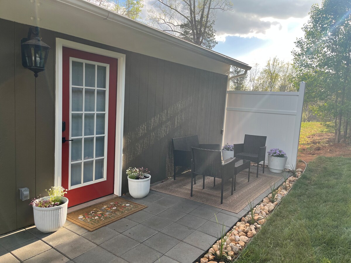 Set in the heart of Wine Enthusiast’s Wine Region of the Year, this newly renovated 2-bedroom, 850 sq/ft terrace level flat with separate entrance, is located in a private setting in the Keswick area. Close to Downtown Charlottesville, we are adjacent to Clifton Inn and Glenmore and minutes to Keswick Hall. After exploring many of Virginia’s wineries, breweries, and historical sites, kick your feet up between the trees in the hammock or share your adventures online with our high speed Wi-Fi.