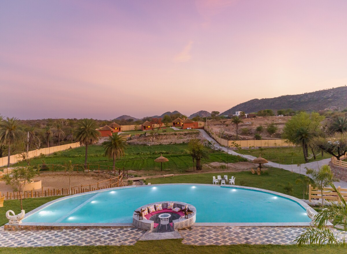 Rifugio di lusso in fattoria vicino a Udaipur | Piscina privata e vista panoramica Rifugiati in una tranquilla e lussuosa fattoria vicino a Udaipur, circondata da una vegetazione lussureggiante e vista sulle montagne. Perfetto per famiglie, coppie e gruppi, offre una piscina privata, ampi prati, camere da letto accoglienti e servizi moderni. Goditi le notti con falò, i pasti casalinghi su richiesta e un rifugio tranquillo a soli 20 minuti dalla città. Ideale per vacanze rilassanti, feste e amanti della natura. In evidenza:
