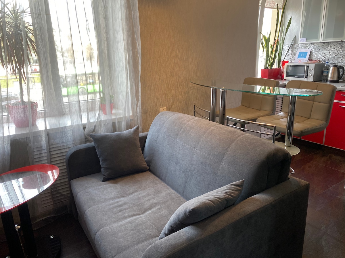 Appartamenti moderni vicino alla stazione ferroviaria Accogliente nel centro di Kharkiv Un luogo ideale per viaggiatori, ospiti della città e viaggi di lavoro. Il monolocale spazioso è dotato di tutto il necessario per un piacevole soggiorno: ✔️ Comodo divano letto matrimoniale Zona ✔️ cucina con tutto il necessario per cucinare ✔️ Bagno moderno con acqua calda ✔️ Lavatrice Wi-Fi ✔️ gratuito e aria condizionata Nelle vicinanze ci sono metropolitana, negozi, caffè, centri commerciali e un comodo interscambio di trasporti. Fai il check-in e fai come se fossi a casa tua!
