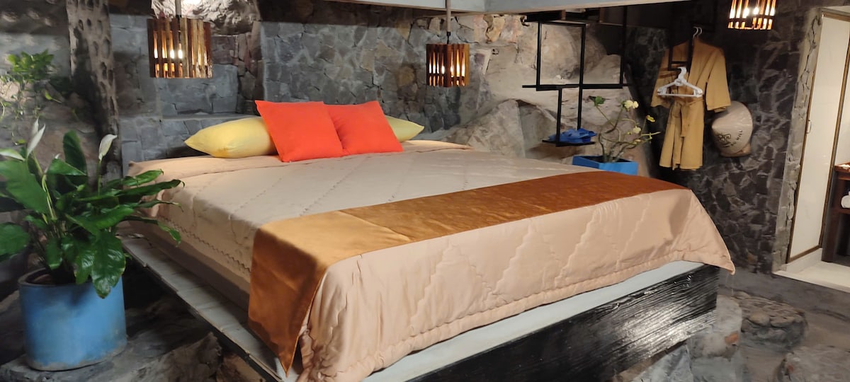 A cozy room on the villa’s lower ground floor. It features a private kitchen with a stove and kettle, plus a bathroom. There is direct access to the mountain-view pool—an ideal spot to relax. The villa also offers a shared workspace for study or work, and a communal kitchen for those who enjoy cooking. The beach is just minutes away, with nature and beautiful views all around. This room is ideal for a comfortable stay with access to all essential amenities.