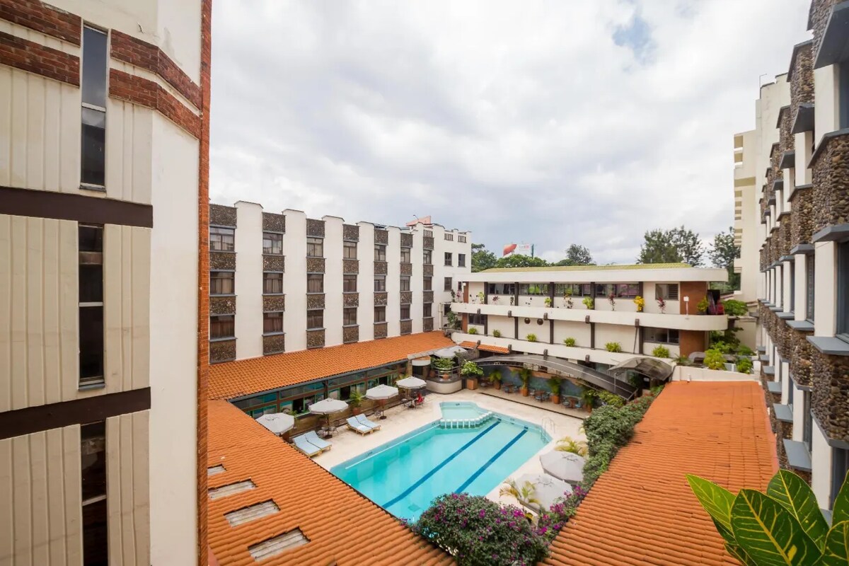 Rilassati in questo tranquillo ed elegante appartamento con una camera da letto completamente arredato e una piscina all'insegna della strada lantana di Nairobi Westlands e un ristorante in loco