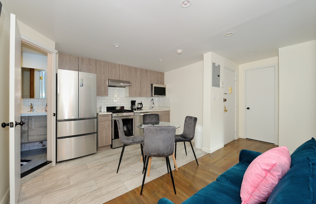 Ti diamo il benvenuto nel tuo incantevole rifugio a Brooklyn! - Appartamento pulitissimo con 1,5 camere da letto, un comodo letto matrimoniale e un letto completo semi-privato. - Internet veloce per lavoro o streaming. - Cucina completamente attrezzata, accogliente soggiorno e bagno privato. - Goditi un facile accesso ai quartieri di Brooklyn e un breve viaggio in treno fino a Manhattan. - Vicino a parchi, ristoranti e mezzi pubblici. - Check-in automatizzato per la tua comodità, con privacy al 100%.