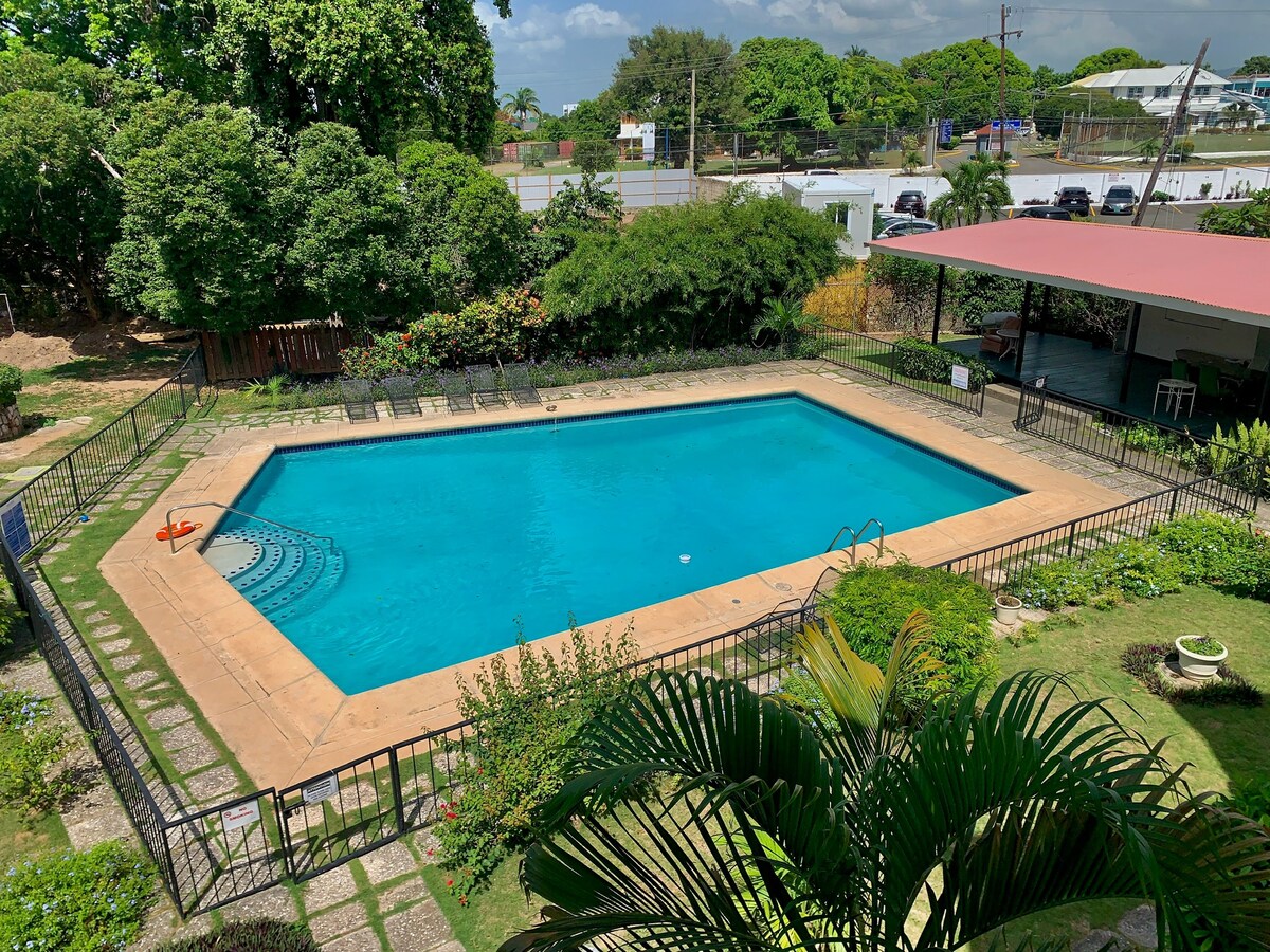 Questo bellissimo alloggio si trova in una posizione centrale nei pressi dell'area di New Kingston, Liguanea e Cross Road. È completamente climatizzato ed è dotato di acqua calda, TV via cavo, Wi-Fi, parcheggio privato, accesso al campo da tennis, un percorso per il jogging e sicurezza recintata 24 ore su 24. Ha un ascensore che porta al pavimento. È di fronte al National Stadium e si trova a 2 minuti a piedi dallo stadio e dall'Arena Nazionale.
