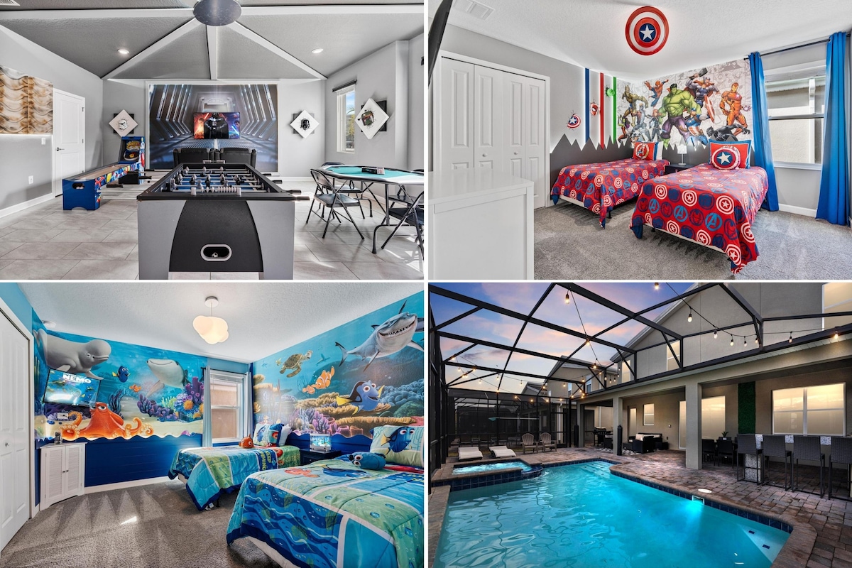 Il perfetto equilibrio tra DESIGN ELEGANTE, COMFORT DI LUSSO e INTRATTENIMENTO SENZA FINE nello splendido Reunion Resort di 9 chilometri quadrati. Avrai a disposizione una piscina privata, una spa, una sala cinema/giochi, 3 suite principali, 3 incredibili camere da letto a tema (MARVEL, FROZEN II, NASA) per bambini o adulti, la più recente console Xbox Series X, una terrazza con piscina di 230 metri quadrati che si affaccia su una splendida foresta e uno stagno, un braciere e un tavolo da biliardo, a pochi minuti dalla Disney.