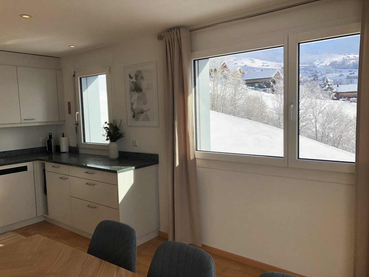 Accogliente chalet di montagna a Unteriberg a 990 m di altitudine con una splendida vista sulle Alpi. Ideale per 2–4 adulti e 1–2 bambini. Gli animali domestici sono i benvenuti. 5 min. dal comprensorio sciistico Hoch-Ybrig. Cucina completamente attrezzata, TV con Netflix, Wi-Fi, lavanderia con lavatrice e asciugatrice. Posizione tranquilla, relax perfetto nella natura. Parcheggio gratuito direttamente davanti alla casa. La stazione di ricarica per auto elettriche è a 5 minuti dalla casa.