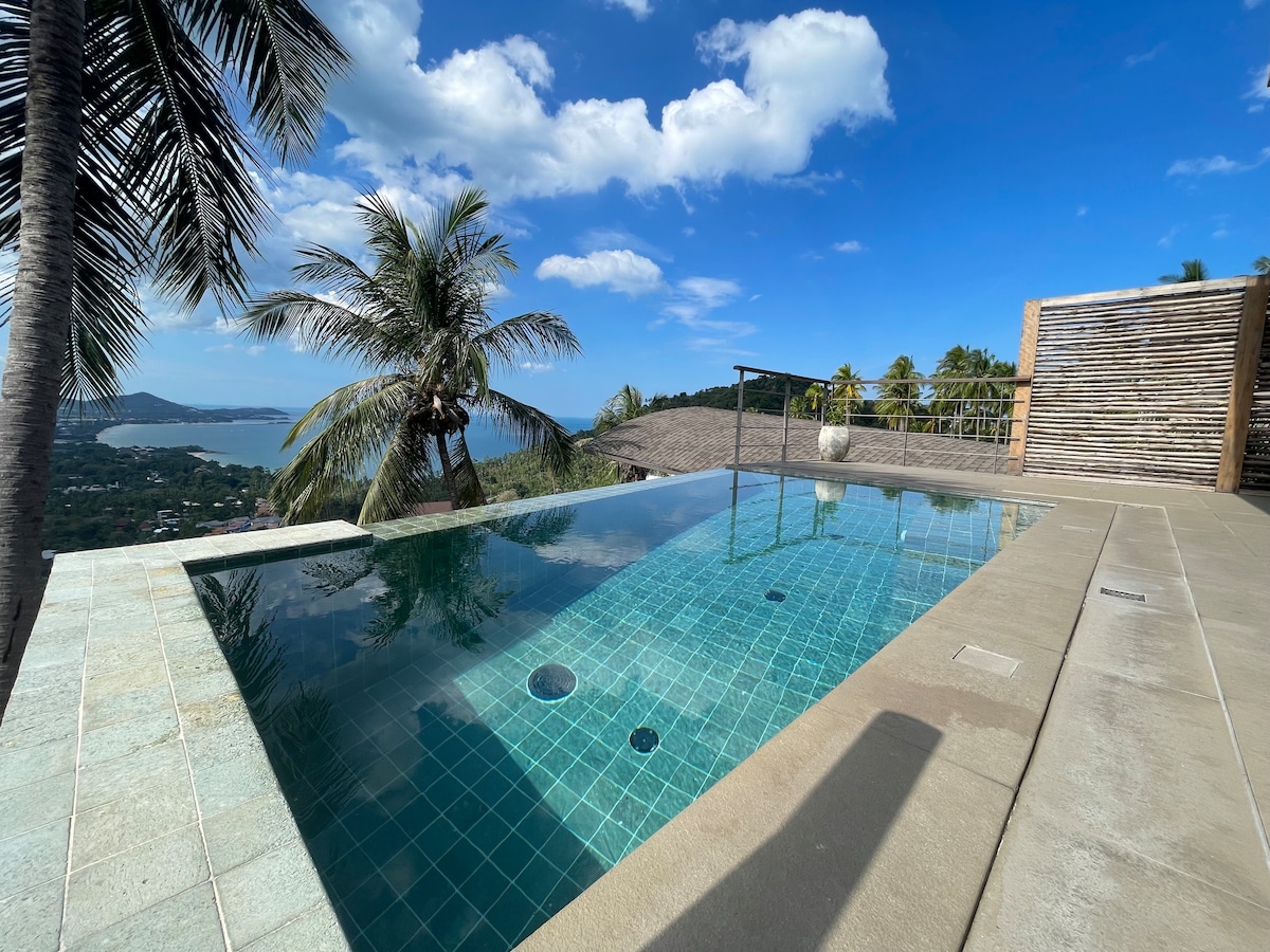 Vista panoramica sul mare e sul tramonto da ogni stanza. Piscina privata a sfioro di 12 metri. Raggiungi a piedi la spiaggia privata in 5 minuti. Tenuta di lusso recintata a Thongson Bay, Samui. 4 camere da letto · 3,5 bagni · fino a 8 ospiti ★Home cinema da 90 piedi ★ 3 aree di lavoro con vista sul mare e monitor, ideali per lo smart working ★ Tapis roulant, poltrona massaggiante, trampolino ★ Cucina completa con lavastoviglie, forno e macchina del caffè ★Doccia all'aperto ★Lavatrice-asciugatrice · Barbecue a gas ★ Manutenzione della piscina e del giardino inclusa ★ Tenuta sulla spiaggia con piscina + accesso privato alla spiaggia ★Parcheggio gratuito.