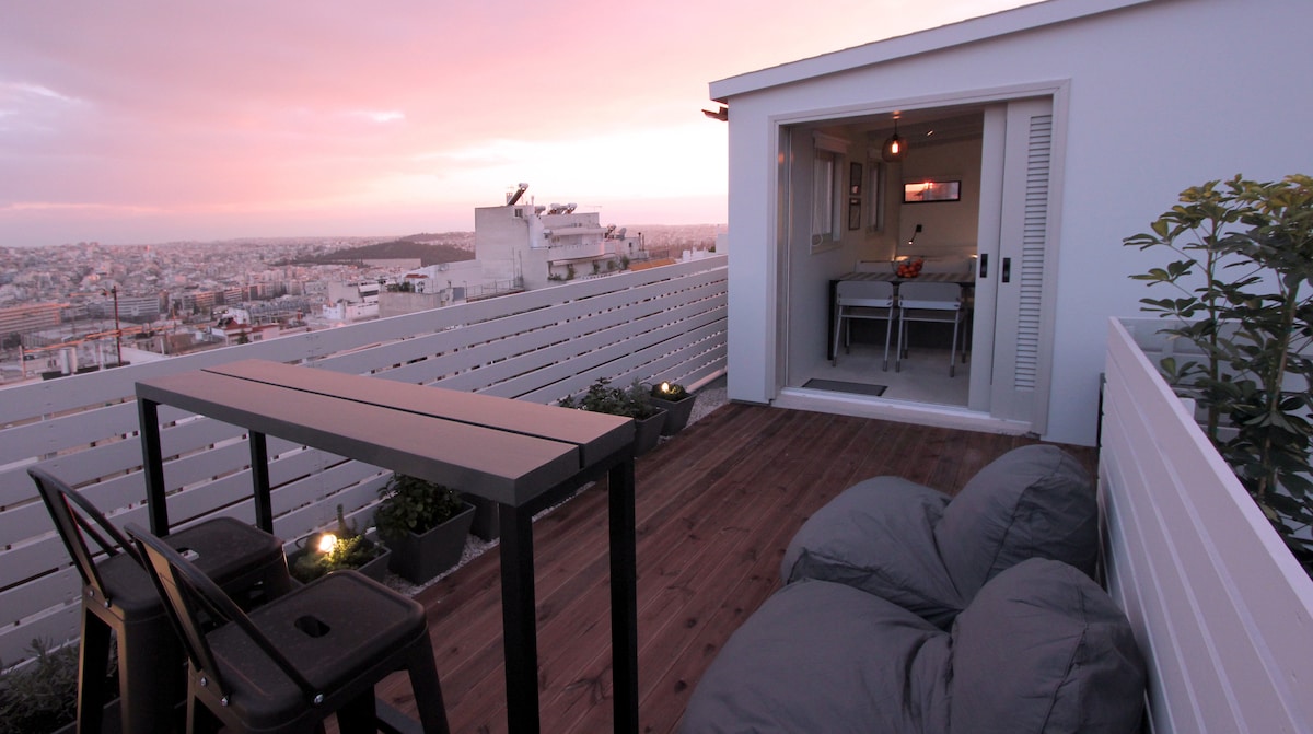 Un piccolo spazio in un tetto ristrutturato da zero e trasformato in monolocale di una designer con una vista panoramica mozzafiato su Atene. Dal giardino pensile si gode di una vista sull'Acropoli, sulla collina di Lycabettus, sul mare e sullo skyline cittadino. È situato nel cuore di Atene, a Kolonaki, un quartiere residenziale sicuro, vicino alla zona storica e commerciale e alle principali stazioni della metropolitana. Ideale per gli ospiti che hanno bisogno di tranquillità ma allo stesso tempo possono raggiungere in pochi minuti la città.
