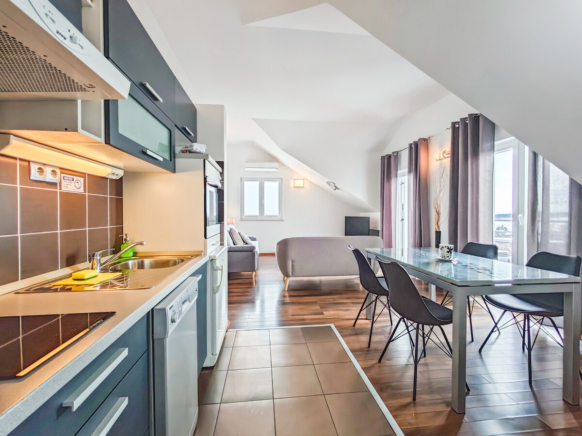 L'appartamento di 60 m 2 è composto da una camera da letto con un grande letto matrimoniale, un bagno, un ampio soggiorno con cucina, un'anticamera e un balcone. L'intera parete sud al mare è in vetro, quindi lo spazio ha molta luce e con un balcone costituisce uno spazio. L'appartamento si trova al terzo piano della casa, che si trova vicino al centro città (5 minuti di piacevole passeggiata lungo il mare) e dal balcone ha una vista aperta sul mare e sulle isole poiché la casa si trova in prima fila sul mare.