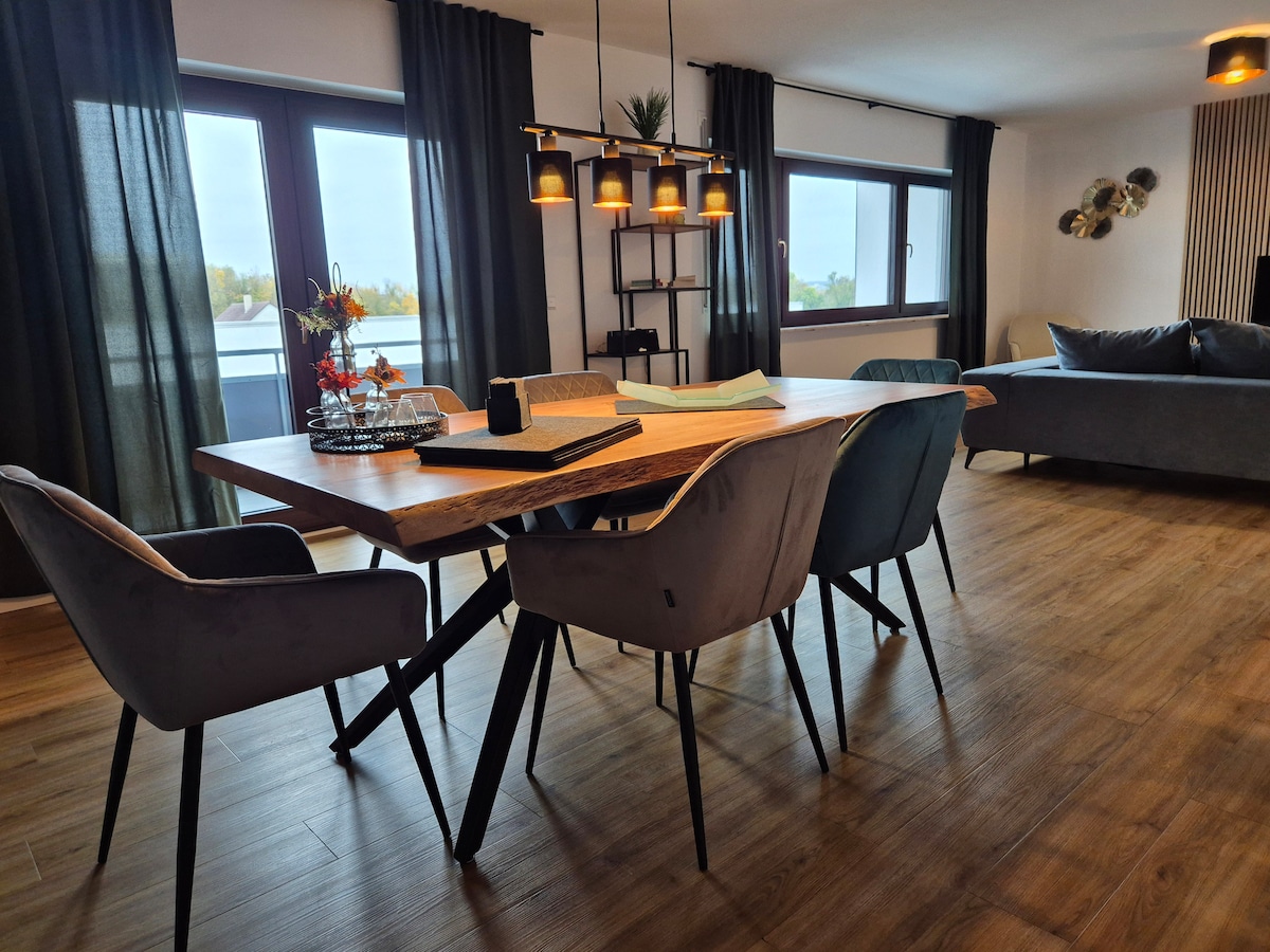 Moderno ed elegante appartamento con 5 camere da letto più giardino d'inverno e terrazza sul tetto a Schwieberdingen. 149 mq di superficie abitabile più 25 mq di giardino d'inverno e 30 mq di terrazza sul tetto e balcone sul lato sud. Caratteristiche: - Letti a molle - Lampade da notte con possibilità di ricarica USB - Cucina completamente accessoriata - Lavatrice e asciugatrice - Piano di lavoro presente - Wi-Fi gratuito - Smart TV - Accesso senza chiavi - parcheggi gratuiti dall'altra parte della strada - Accesso non privo di barriere architettoniche (scala)