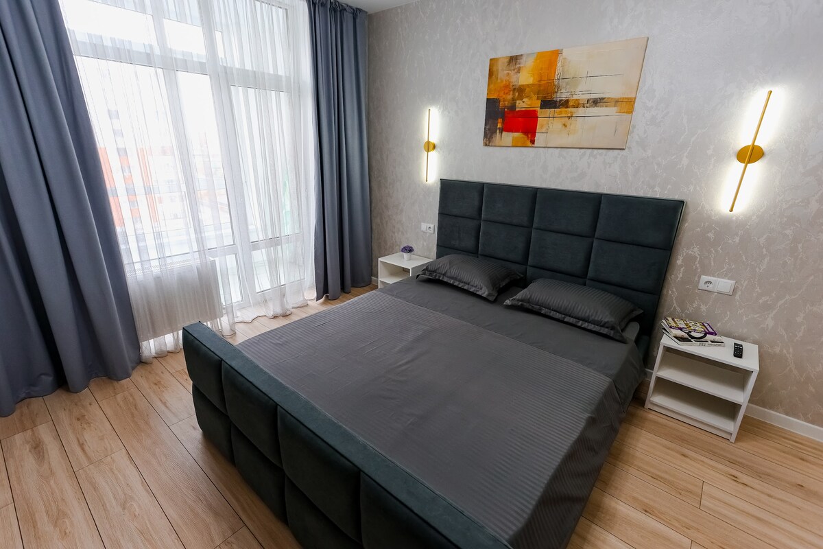 Appartamento monolocale con una camera da letto nel centro della città con riparazioni fresche e mobili nuovi. Situato in un nuovo edificio costruito nel 2020, con ascensore giapponese. C'è un parco giochi e un parcheggio nel cortile. Nelle vicinanze: lungomare, centro commerciale, centro commerciale, parco centrale, negozi, caffetterie. C'è tutto il necessario per il tuo soggiorno confortevole: boller, piatti, piatti, nuovi elettrodomestici, prodotti per l'igiene, Wi-Fi, TV satellitare, TV 60 diagonale. Forniamo qualsiasi forma di pagamento e documenti di rendicontazione.