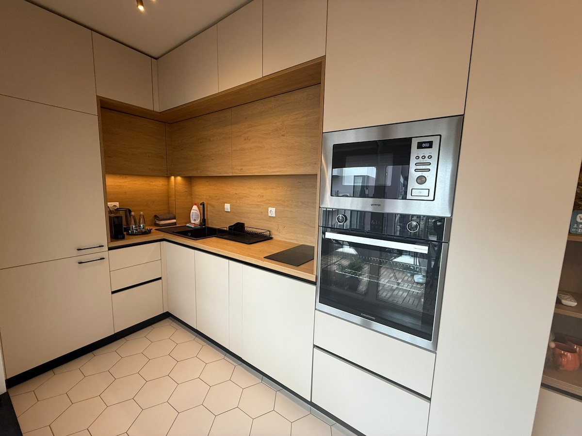Newly furnished home The Blue Sky Penthouse. Centrally located in a new building close to metro stations. ★"One of the most fully equipped AirBnB places we have stayed in." FEATURED: ➤ Dedicated, top covered parking spot ➤ Quiet Bedroom and LUX Bathroom ➤ Furnished terrace - 75m2 in size ➤ 4K Smart TV 65 Inch and Sofa Bed ➤ Workspace with excellent Wi-Fi ➤ Well equipped kitchen ➤ Two Air Conditioners. Craving some bakery goods? You are in luck! There's a bakery located next to the entrance.