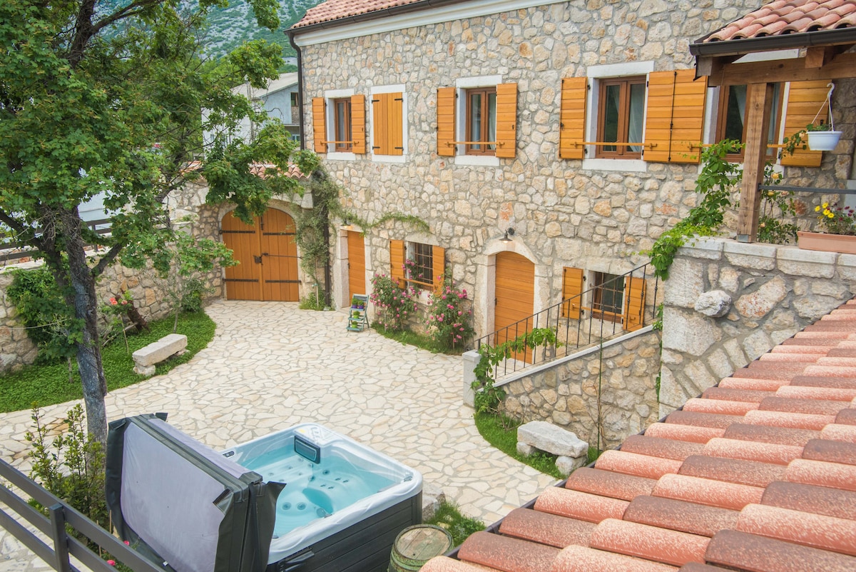 Casa tradizionale in pietra nel centro storico di Dobrinj con pavimento in quercia, situata su una piccola collina con splendida vista panoramica, dove si sente solo la campana della chiesa e i grilli. Stradina vicino a un solo negozio e scale che conducono alla chiesa di Santo Stefano. Subito dopo la chiesa c'è la casa n. 23. Dopo aver esplorato un sacco di fantastiche spiagge in tutta l'isola, puoi rilassarti facendo un bagno termale in terrazza.