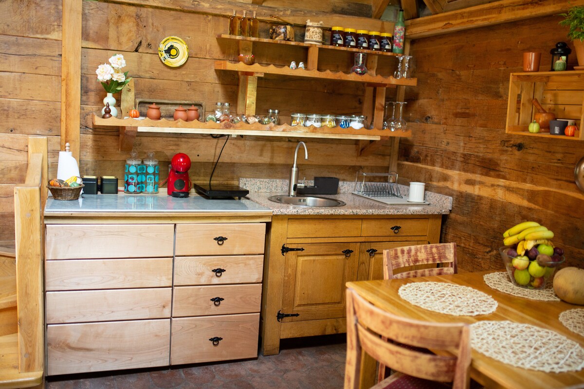 Il cottage è costruito con materiali naturali, seguendo principi sostenibili, e fa parte di una tradizionale famiglia rurale, vicino a cibo fatto in casa e animali da fattoria. Non c'è una cucina, ma offriamo pasti dal nostro menu che puoi scegliere in base alle tue esigenze. Dispone di TV, wifi e una grande scrivania per due. Un trattamento speciale è un riposo pomeridiano nella vasca da bagno con vista sulla foresta.
