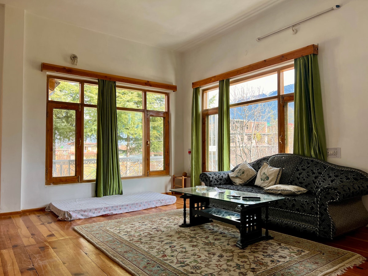 Porta tutta la famiglia in questo fantastico alloggio con tanto spazio per divertirsi. Puoi soggiornare in pace con la natura con tutte le strutture del moderno stile di vita urbano. puoi sentire il suono del fiume Beas e il cinguettio degli uccelli dal tuo balcone. In inverno puoi ammirare la vetta delle montagne innevate e le persone che fanno parapendio in tutta la stagione