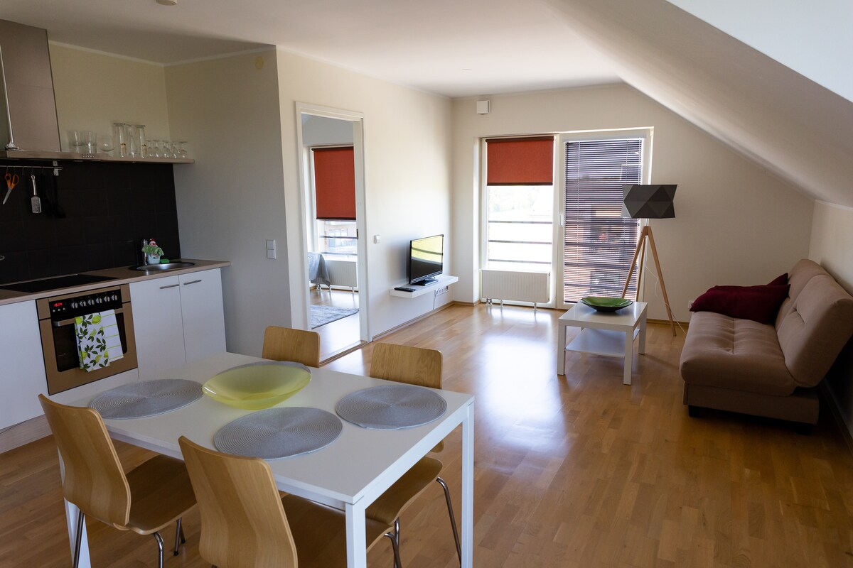 Meet your home away from home. This cozy apartment is located about 4min drive or 15min walk from the town square. It comes with a TV, WiFi, kitchen, one bedroom with a double bed and pack´n´play for infants, pull out couch in the living room and seating area on balcony. Sandbox for kids behind the building. Free public parking is available. The kitchen includes kitchenware, stove, fridge, microwave and a coffee maker. Two big markets (Rimi and Coop) situated 100 meters from the apartment.