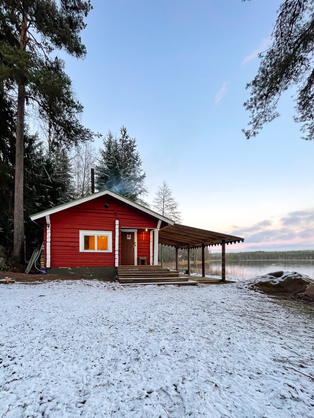 Fuga romantica o con un amico per rilassarsi. Un'idilliaca "suite cottage" a Kouvola sulla riva del lago Rapojärvi. Cucina tabacco (piano cottura, caffettiera, bollitore, microonde), letto matrimoniale, culla da viaggio disponibile per il bambino su richiesta, tavolo da pranzo, tv con cast cromato, internet, water wc, doccia, spogliatoio e sauna in legno.. Griglia a legna esterna con attrezzatura. Ampia pedana vetrata con termosifone. Il prezzo include biancheria da letto, asciugamani, alberi, tavole da SUP e una barca a remi. Il rubinetto diventa acqua potabile e calda.