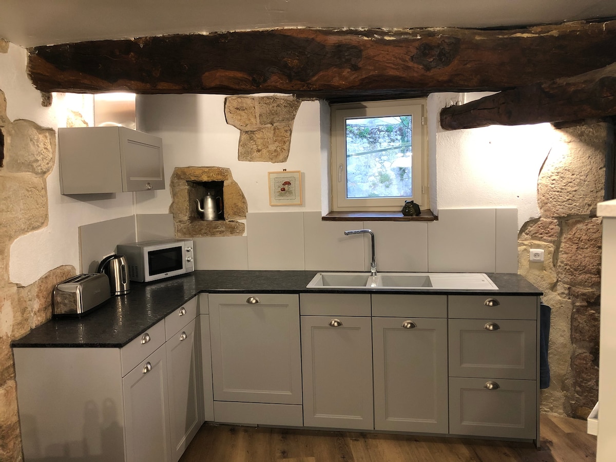 Piccola casa con ingresso privato. Terrazza sospesa con vista sulla valle e sulla natura. Dopo una passeggiata nella zona, potrete rilassarvi in un ambiente verde o a bordo piscina. Avete il vostro soggiorno, cucina solo per voi. Posto idilliaco per rigenerarsi e trascorrere un soggiorno tranquillo. Questo cottage non è ADATTO AI BAMBINI . Grazie per la vostra comprensione