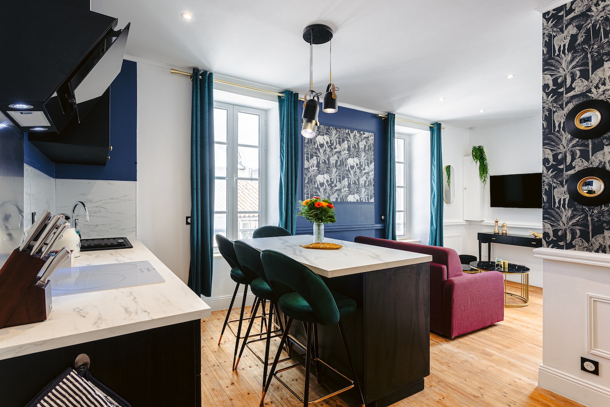 Bilocale completamente ristrutturato sul vecchio porto ai piedi delle torri. 45 mq declinati in un bel soggiorno con una cucina completamente attrezzata e per la parte salotto, un comodo divano per riposare dopo le vostre passeggiate iodate. TV e Wi-Fi inclusi. Bagno con vasca indipendente dalla camera. Lavatrice e asciugatrice sono a vostra disposizione. WC separato. Bella camera con letto matrimoniale, cabina armadio e scrivania che si affaccia su un cortile interno per notti tranquille.