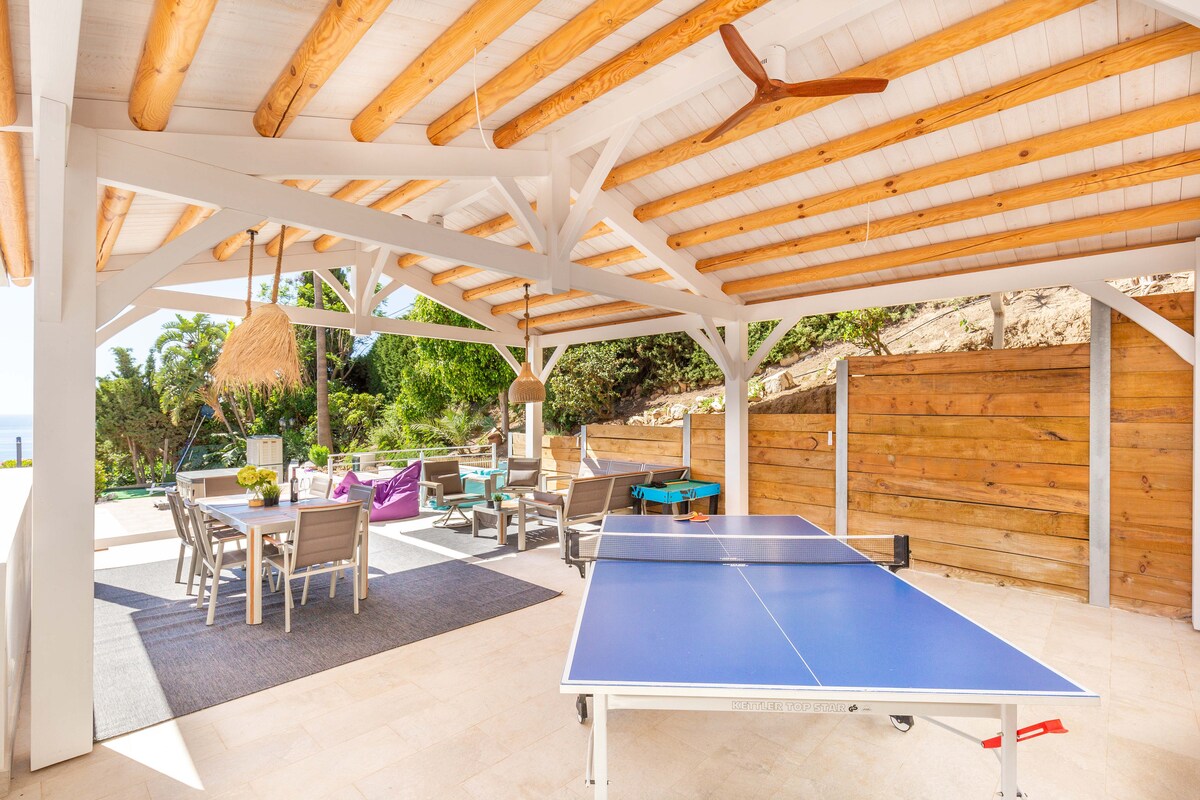 SPLENDIDA VILLA con SPLENDIDE VISTE SULL'OCEANO! Patio d'ingresso con picchio. Soggiorno con caminetto e zona ufficio. Sala da pranzo marocchina ad arco. Bella cucina arredata. Terrazza coperta con grande tavolo da pranzo e zona per lettini e TV. Ampia camera matrimoniale e doccia en-suite. 2 ° angolo cottura con zona lavanderia. 2 camere da letto, con doccia in camera. Ampia terrazza coperta con zona barbecue, sala da pranzo e sauna. Piscina (acqua salata) e ampio terrazzo soleggiato. Parcheggio privato per 3-4 auto.