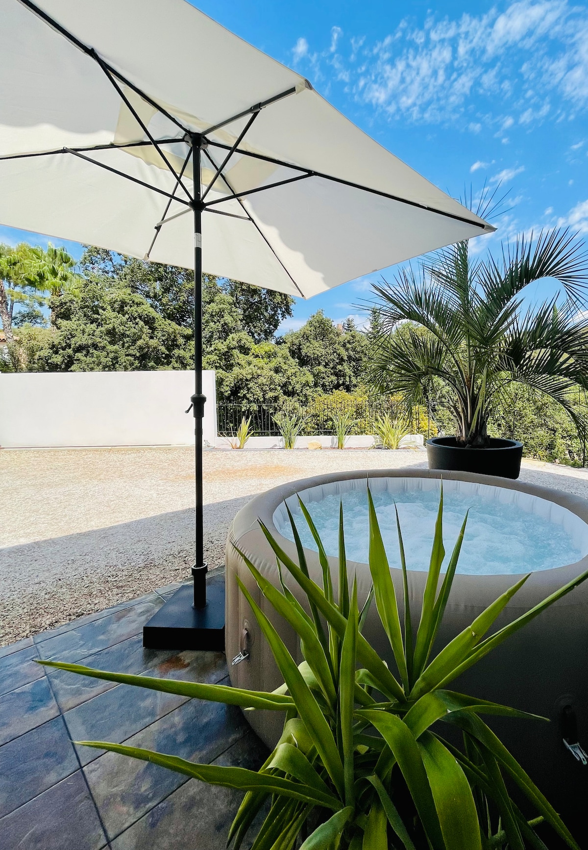 Le logement avec jacuzzi privatif couvert se trouve dans un cadre campagne tout en étant proche du centre ville, des plages et commerces. Il se situe en bas d’une villa moderne en restanque arborée d’oliviers, chênes et pins centenaires. Vous apprécierez le calme, le chant des oiseaux ainsi que celui des cigales en été. Vous pourrez garer votre véhicule à l’intérieur juste devant l’appartement grâce au portail électrique avec badge. Un moment de détente assuré sur la terrasse privative avec spa