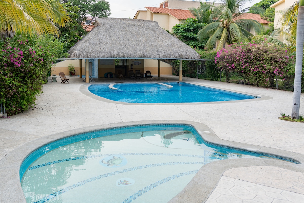 Disfruta unas vacaciones en este comodo departamento c/ aire acondicionado y alberca cerca Del Mar 3 piso 🌅A 4 km de Bahia chahue -2 recámaras matrimoniales -1 sofá cama -Plancha -Cocina equipada (estufa c/ horno, refrigerador,congelador,licuadora, cafetera y utencilios) -Estacionamiento -Baño completo -WiFi satelital -Alberca mier-lunes 9-21hrs Relájate viendo tus series favoritas con Disney+, Netflix y Amazon Prime, HBO max en una Smart tv Ideal para quienes buscan comodidad y privacidad