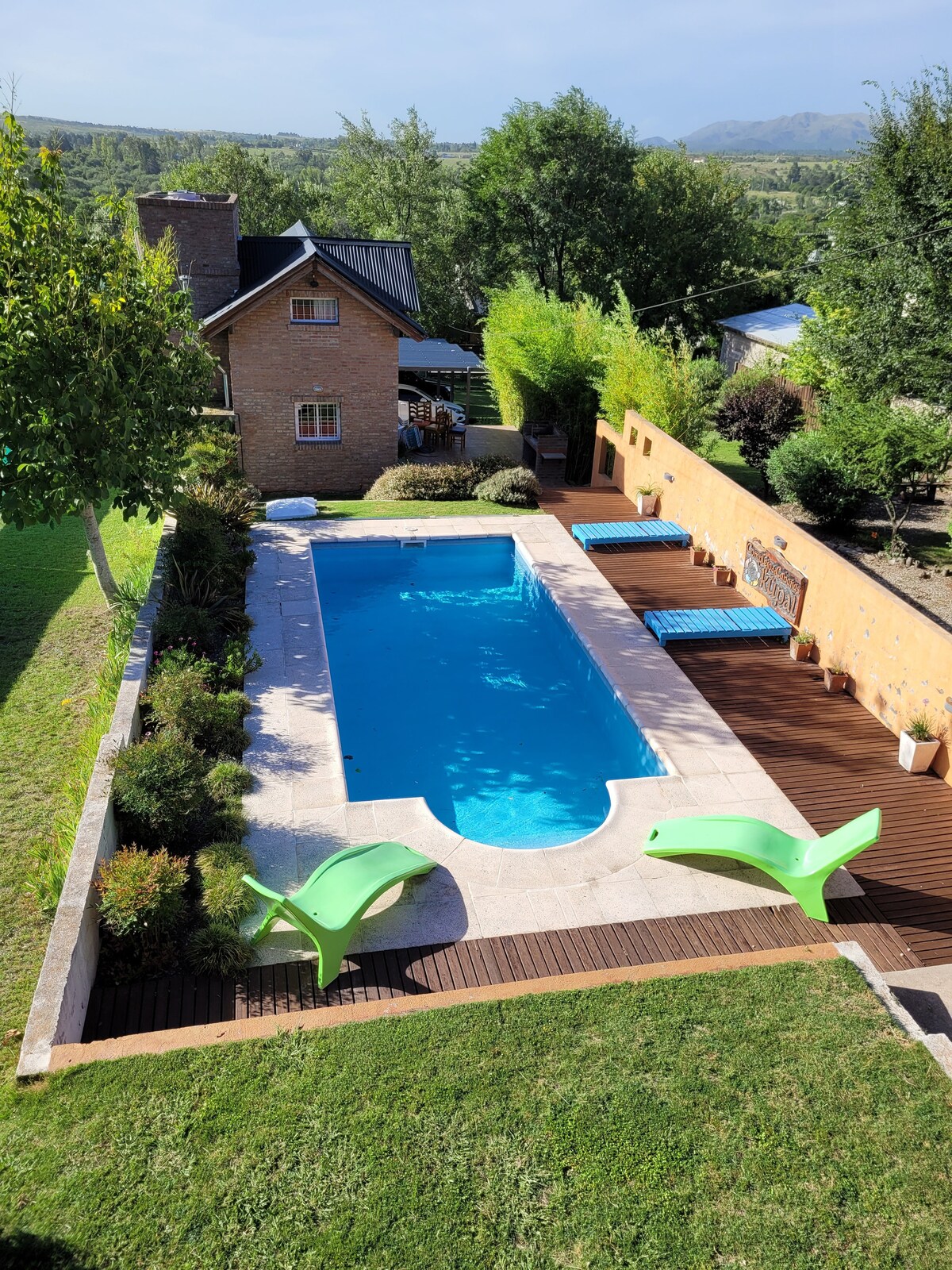 Casa con alma, ideal para familias y amigos. Lugar para 11, ideal 8, dos cuartos matrimoniales. Bienvenido a nuestro refugio en Sierras Chicas. Somos una familia de 7, nos gusta recibir y que sientan como hogar. Te ofrecemos una casa con historia, por las creaciones artesanales del anfitrión. Madera, hierro y cariño se combinan para crear ambientes acogedores. Naturaleza, jardín, pileta, ubicación privilegiada cerca del aeropuerto, de canchas de golf y de atractivos de las Sierras Chicas.