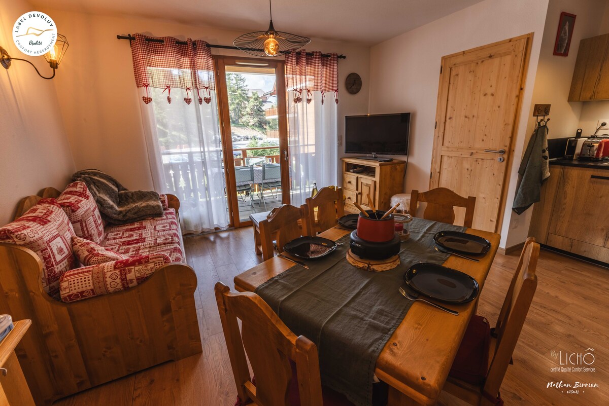 Cocon chaleureux au pied des pistes, avec terrasse plein sud et vue imprenable sur les montagnes. Ici, on chausse les skis depuis la porte, on partage une fondue le soir et on savoure le calme de la nature. Ambiance montagne, cuisine équipée, TV connectée, parking couvert, animaux bienvenus… En accès direct depuis l’immeuble : galerie marchande avec restos, bars, location ski/VTT, supermarchés. Un lieu simple et unique pour se ressourcer, été comme hiver.