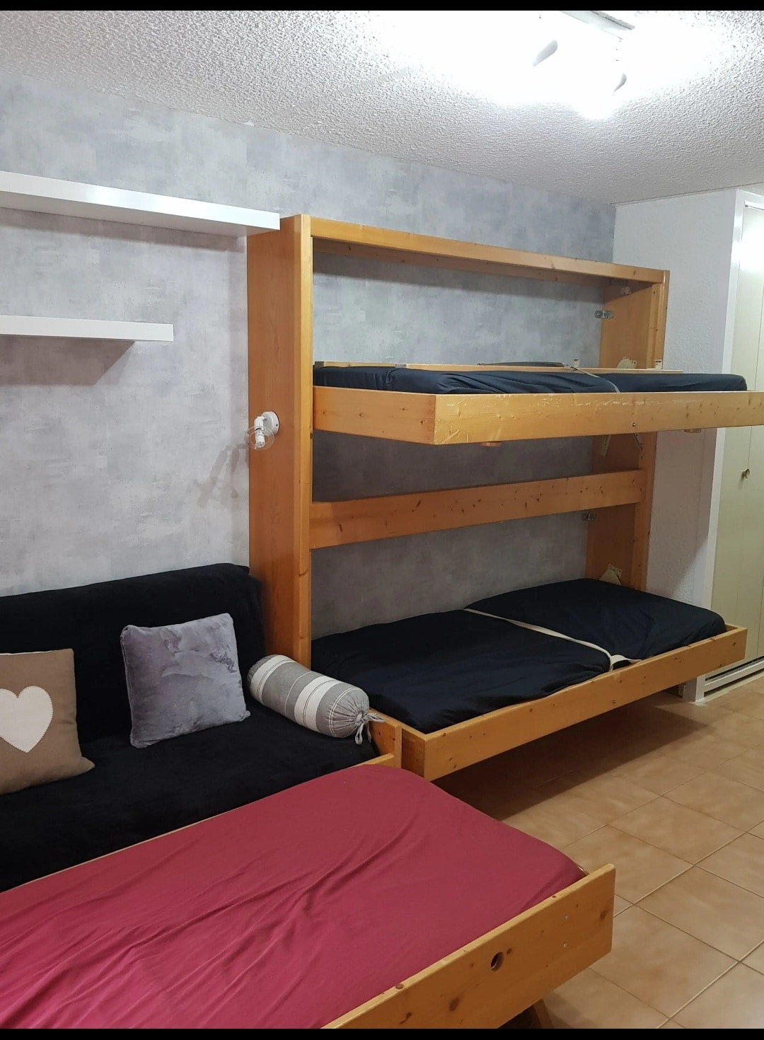 Appartement 31 m2, emplacement idéal avec la navette au pied de l’immeuble, retour ski aux pieds. À côté du plan d’eau l’été. Une petite chambre avec un lit double, lits superposés dans le coin montagne, canapé convertible dans le salon. Grande cuisine toute équipée avec lave-vaisselle. Balcon, casier à ski. Pendant les vacances scolaires, location à la semaine uniquement. Attention les draps et le ménage ne sont pas compris dans la location.