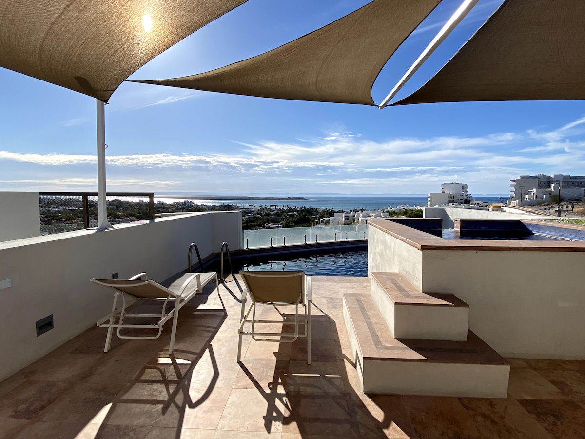 Ranked #1 Romantic Airbnb Vacation Rental in La Paz by Trip101, Casa Cousteau is a 2-bedroom penthouse in a highly-desired private residence. This luxury penthouse lies in the heart of La Paz, next to the city center overlooking the Sea of Cortez and waterfront boardwalk. It has everything you need, and is close to everything that makes La Paz great. Enjoy breathtaking views and sunsets from your balcony or the rooftop terrace with heated soaking pool.