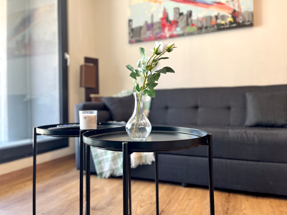 Ampio ed elegante appartamento di 110 mq più terrazza! Soggiorno, sala da pranzo e cucina integrata completamente attrezzata: frigorifero side by side, forno elettrico, microonde, piano cottura in vetroceramica, cappa, lavastoviglie. lavatrice / asciugatrice. La terrazza dispone di barbecue a gas integrato. L'interno è spazioso e molto confortevole. L'arredamento è nordico e rilassato. Il bagno principale ha una doccia doppia e c'è un altro bagno completo per gli ospiti. Dispone di parcheggio sotterraneo e parcheggio per gli ospiti