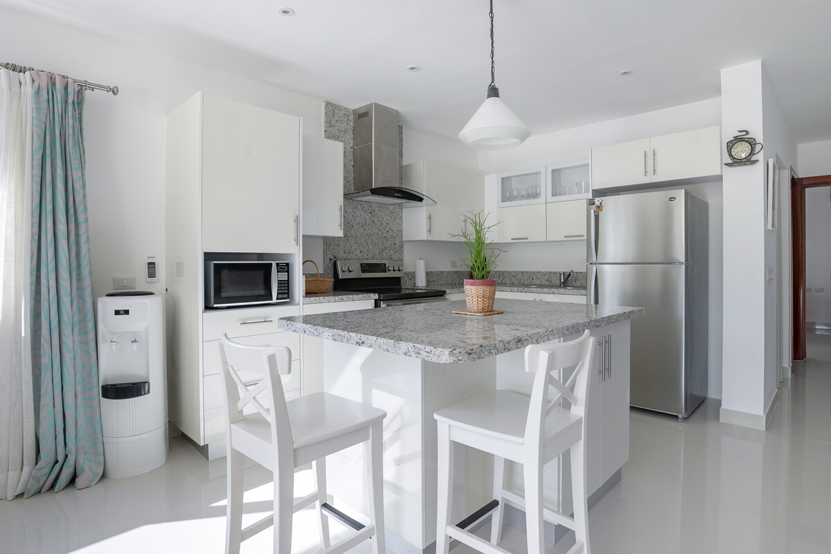 Situata aBayahibe a 300mt dalla Spiaggia Dominicus.L’ appartamento Luxury offre accesso Tracadero, WiFi gratuita, lavatrice, 2stanze da letto, 2 bagni,1stanza con materasso King, Queen, salotto con tavolo e 2divani letto. 1 terrazza confortevole munita d1 un comodo divano esterno da sfruttare durante gli aperitivi, colazioni,cene in condivisione all'aperto con amici. Appartamento con piscina residenziale, giardino, parcheggio privato gratuito. Unico Costo a parte Aria Condizionata 13$ al giorno.