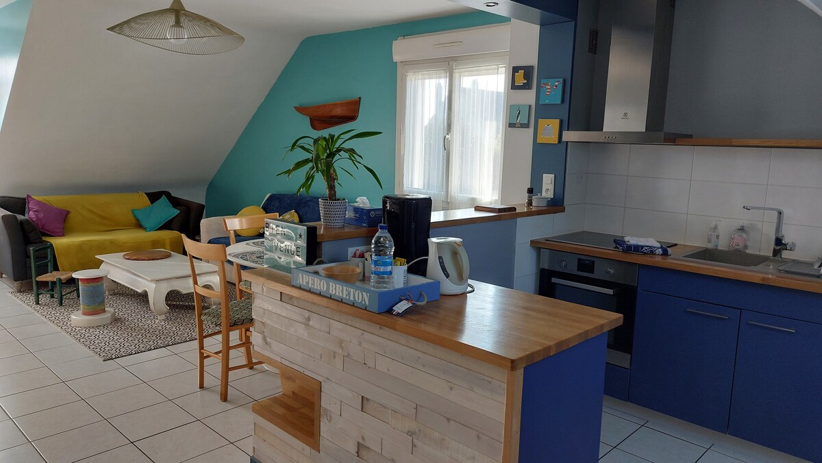 Godetevi un alloggio accogliente a 2 passi dal porto e dalla spiaggia. Situato nella strada pedonale, godetevi tutti i servizi ai piedi dell'alloggio. Cucina attrezzata con: forno, forno a microonde, piano cottura a induzione, macchina per il caffè Tassimo, bollitore, tostapane, frullatore... Divano, tv, home cinema Camera con letto 140X190 Bagno con doccia con servizi igienici, lavandino, asciugacapelli, lavatrice, asciugatrice, asse e ferro da stiro. Situato al 1° piano di una casa bretone.