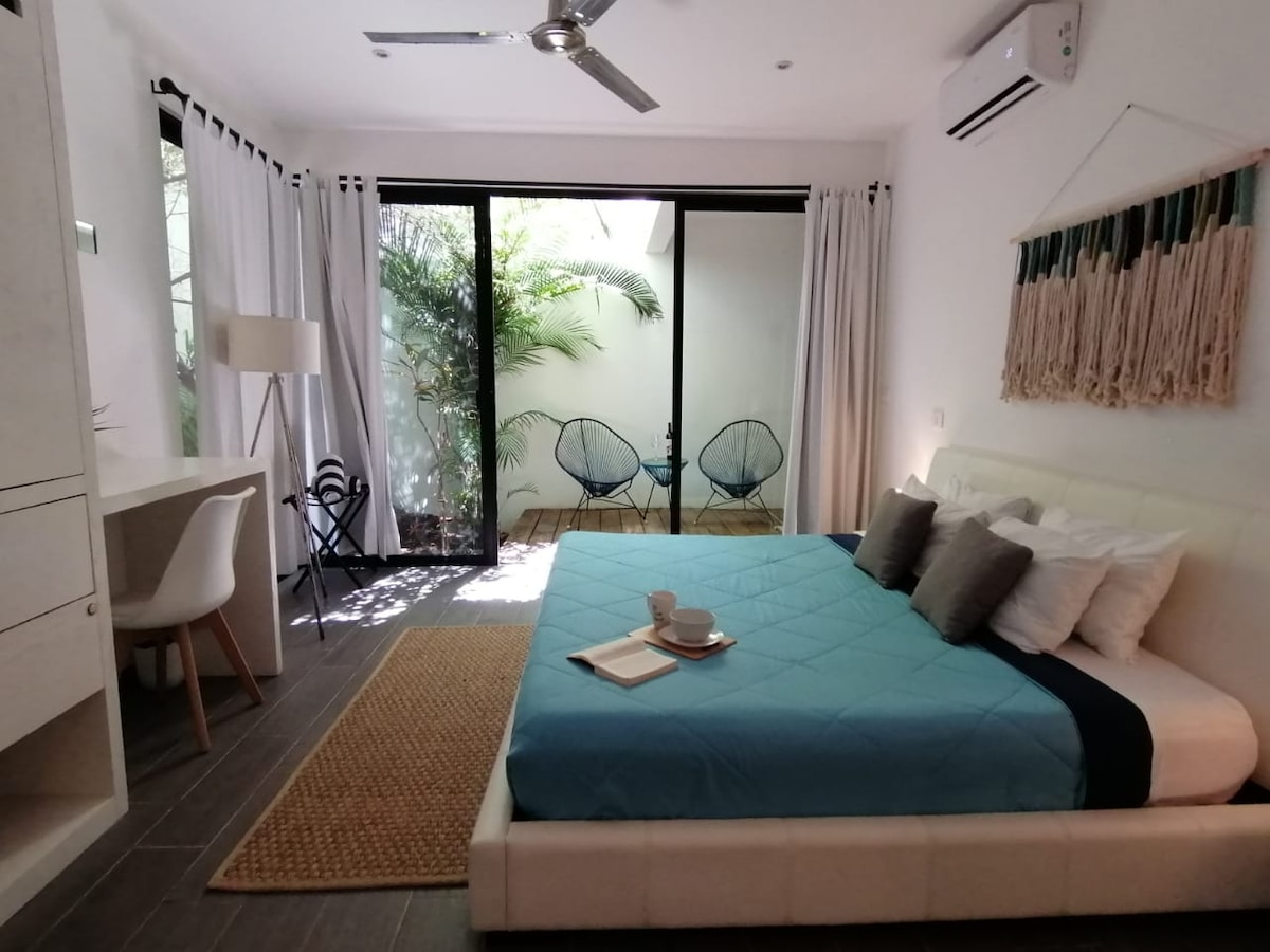 La tua casa vacanze lontano da casa; ideale per coppie, nomadi digitali o viaggiatori solitari. Con internet veloce, camera da letto con letto king size, aria condizionata, angolo cottura e balcone con piscina. Avrai accesso a incredibili aree comuni come la piscina sul tetto, le vasche idromassaggio e molto altro ancora. Una delle posizioni più comode, sarete a pochi passi da alcuni dei migliori ristoranti, negozi e supermercati; e vicino alla spiaggia. Avrete tutto il necessario per vivere l'esperienza di Tulum.