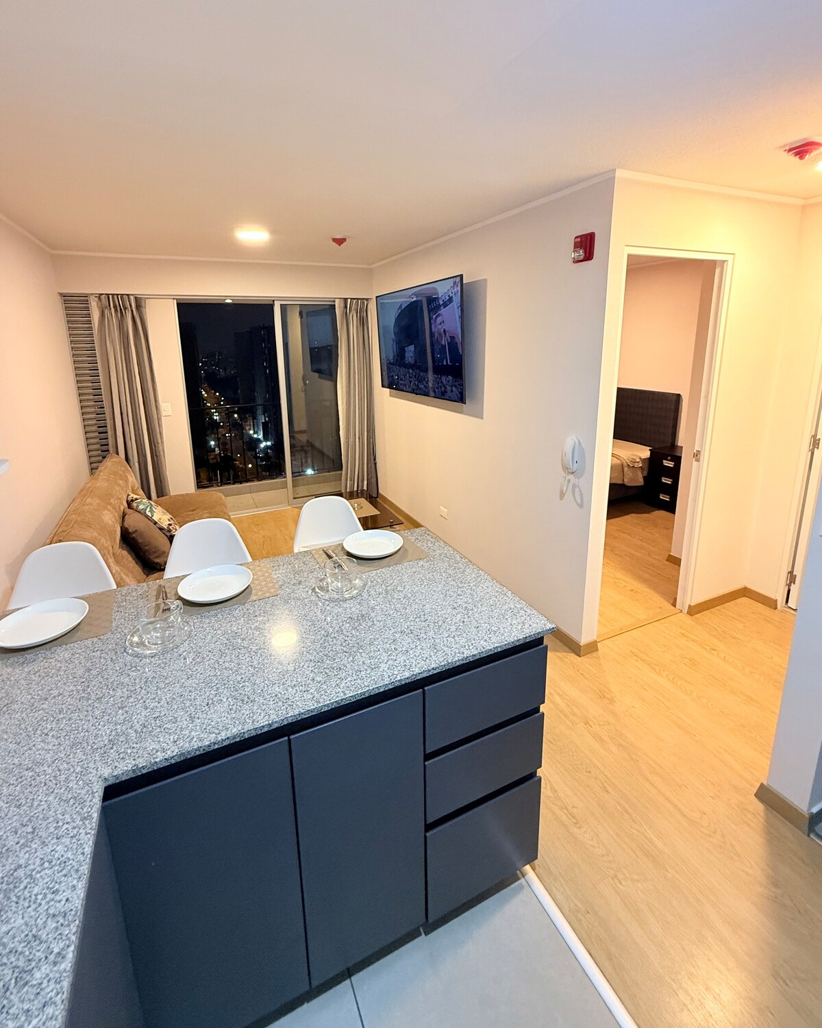 Habitación de 35mts2 con kitchen tipo americana en 4to piso con entrada independiente, amoblado (cama de 2 plazas, mueble modular doble, cómodas y closet) cuenta con tv Smart de 42" con NETFLIX y cable, un refrigerador, cocina, hervidor de agua, licuadora, tostadora, arrocera, ducha con terma, wifi, menaje en la cocina (vasos, tazas, platos, cubiertos), también proporcionamos toallas de manos y de baño.