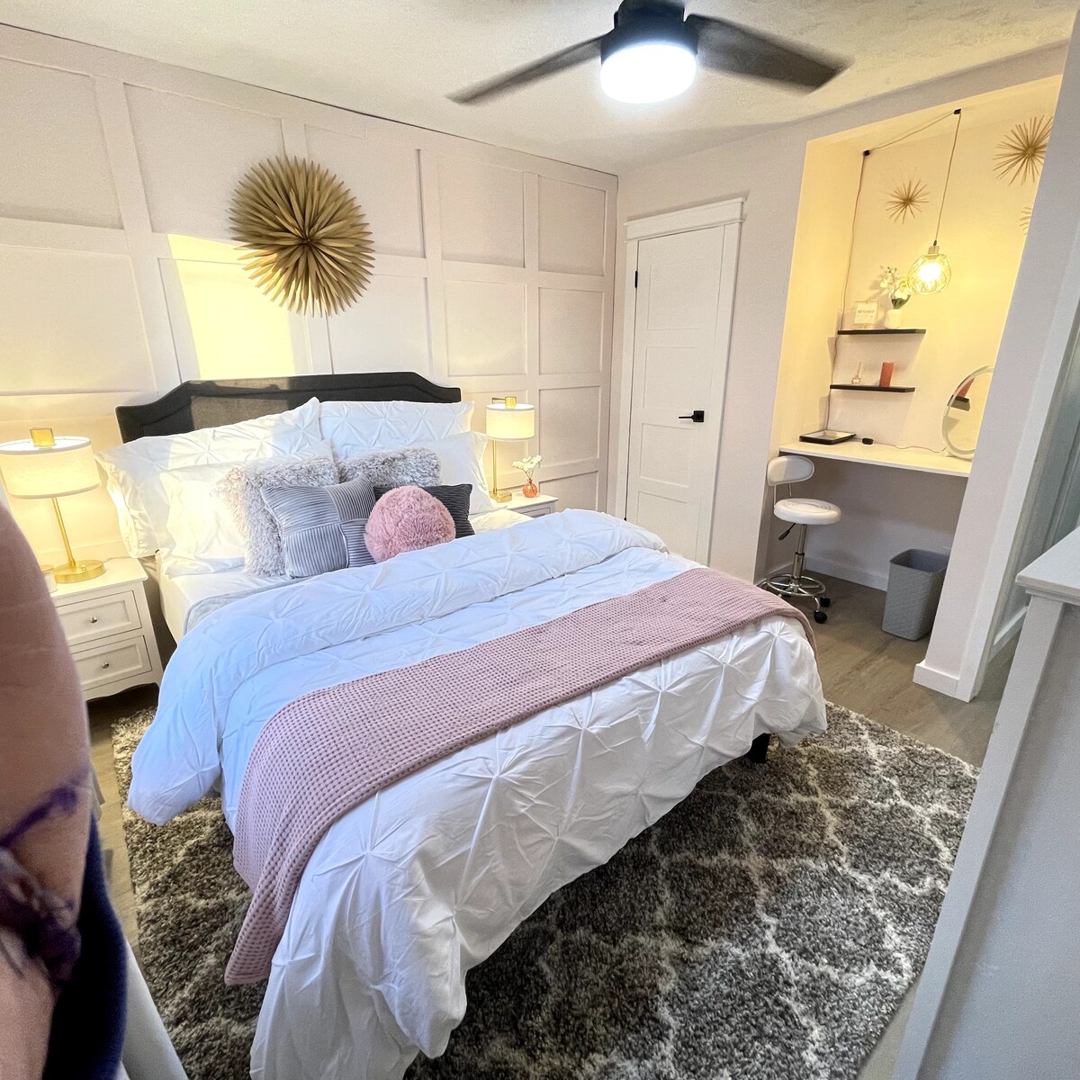 Entra in uno spazio privato e accogliente. Rilassati guardando la TV a letto o sul divano. Questo alloggio fa parte del nostro seminterrato, quindi potresti sentire la vita quotidiana al piano di sopra. Per la tua sicurezza, all'ingresso è installata una telecamera Ring che illumina l'ingresso quando è buio. Il parcheggio si trova sulla strada pubblica ben illuminata. Cammina facilmente sul nostro marciapiede dedicato Airbnb, senza gradini, e raggiungi il retro della casa. Sarai in uno spazio sereno che ti farà sentire come a casa.