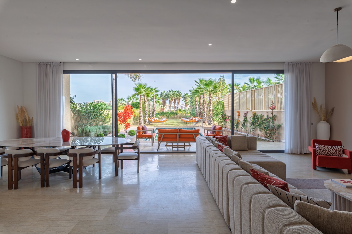 Scopri Villa Kniza: il lusso incontra la natura con vista sul campo da golf e sulle montagne dell'Atlante. Dotato di piscina e arredi eleganti. Situata nel sicuro ARGAN GOLF, a soli 15 minuti dal centro città e dall'aeroporto, la villa offre pace e comodità. È il luogo perfetto per rilassarsi, ricaricarsi e divertirsi con i propri cari, ideale per famiglie, coppie o amici.